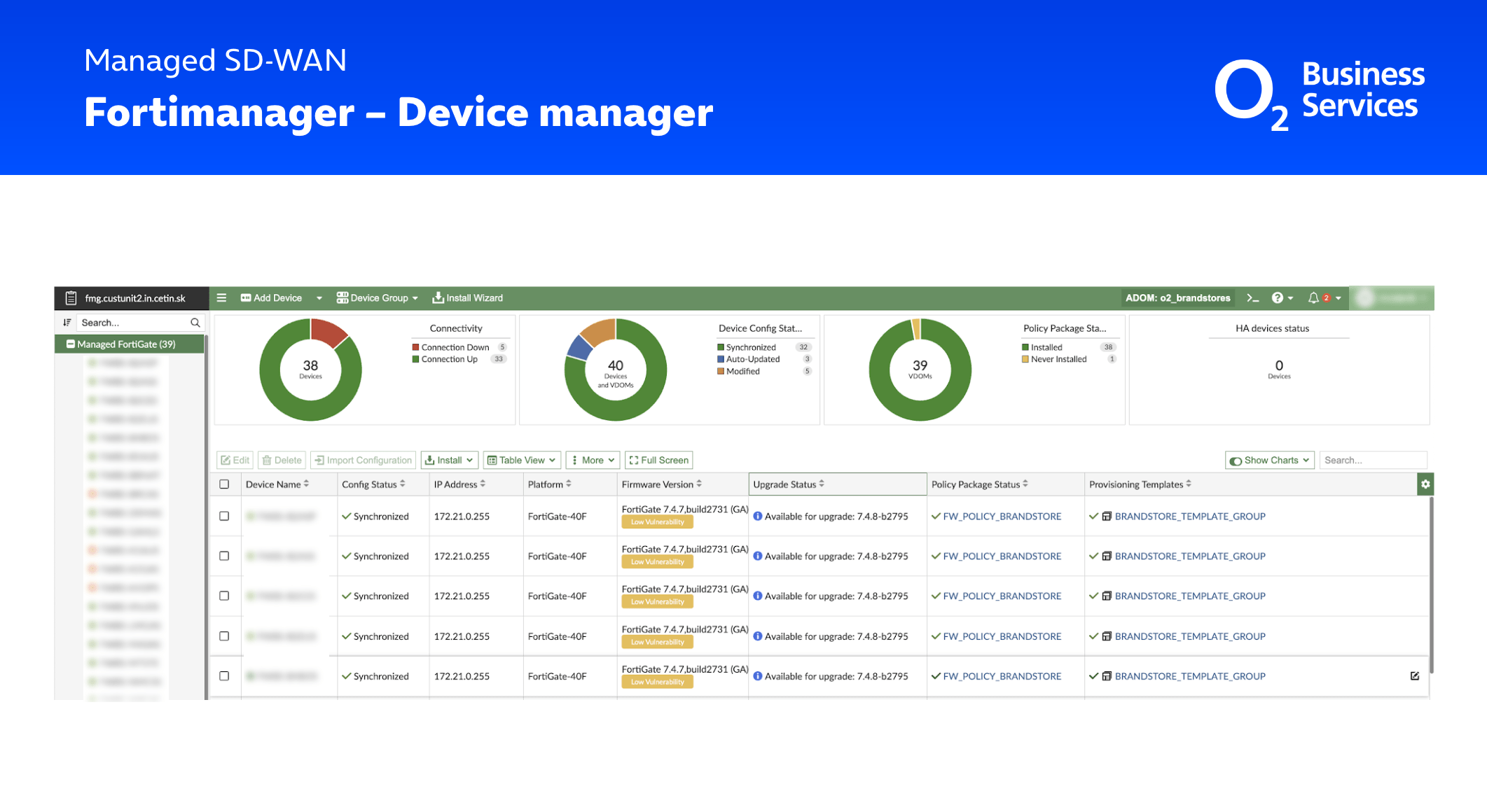 SD-WAN Manager poskytuje centralizovanú správu celej SD-WAN infraštruktúry vrátane hromadnej konfigurácie, riadenia politík a automatizovaného nasadenia pomocou šablón a skriptov.